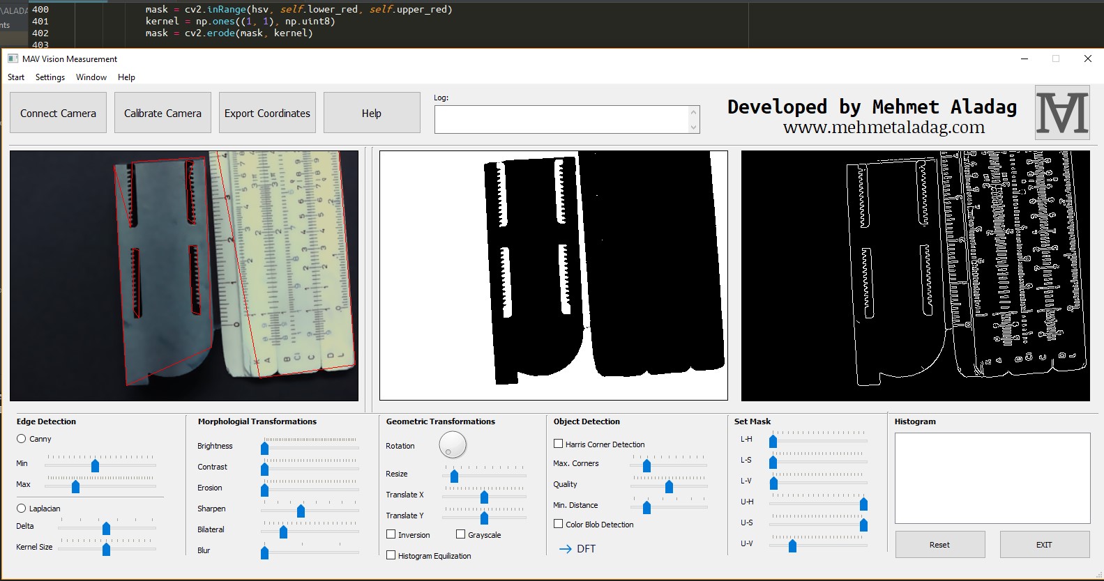 At this point, the coordinates (tooth profile) of the pixels that make up the outer profile of the gear are known and it is necessary to develop some computer vision algorithms that can use this data to measure spur gear parameters. It is well known that many of the gear parameters correlate with each other with known equations. For instance, the pitch circle diameter (Do) is associated with the number of teeth and the outer diameter (Da), while the module (m) is associated with the pitch circle diameter (Do) and the number of teeth (Z). In this case, three computer vision algorithms were developed to calculate the outer diameter, the root diameter and the number of teeth of the gears to be measured, then other gear parameters were calculated using equations based on these parameters. Each edge pixel in the image is then converted to a dot cloud. The obtained dot clouds are generated in the background, and X and Y coordinates are obtained in millimeters.